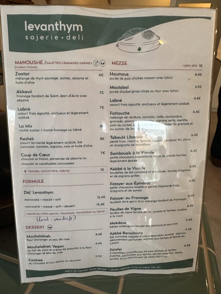 Au Levanthym, on déguste une cuisine de street-food libanaise faite maison, sur place ou à emporter. Des mezze divins – houmous, feuilles de vigne, Moutabal, falafels, fattouche – des manoushé (galettes libanaises garnies) au zaatar, akkawi (fromage fondant de Saint-Jean-d’Acre) ou Labné – des desserts ultra gourmands à la fleur d’oranger et eau de rose… Chaque bouchée invite au voyage dans les pays du Levant. avec ce petit twist alsacien qui apporte la touche d’originalité, tels les fonds de tarte d’une ferme de la région ou les bretzels au zaatar.