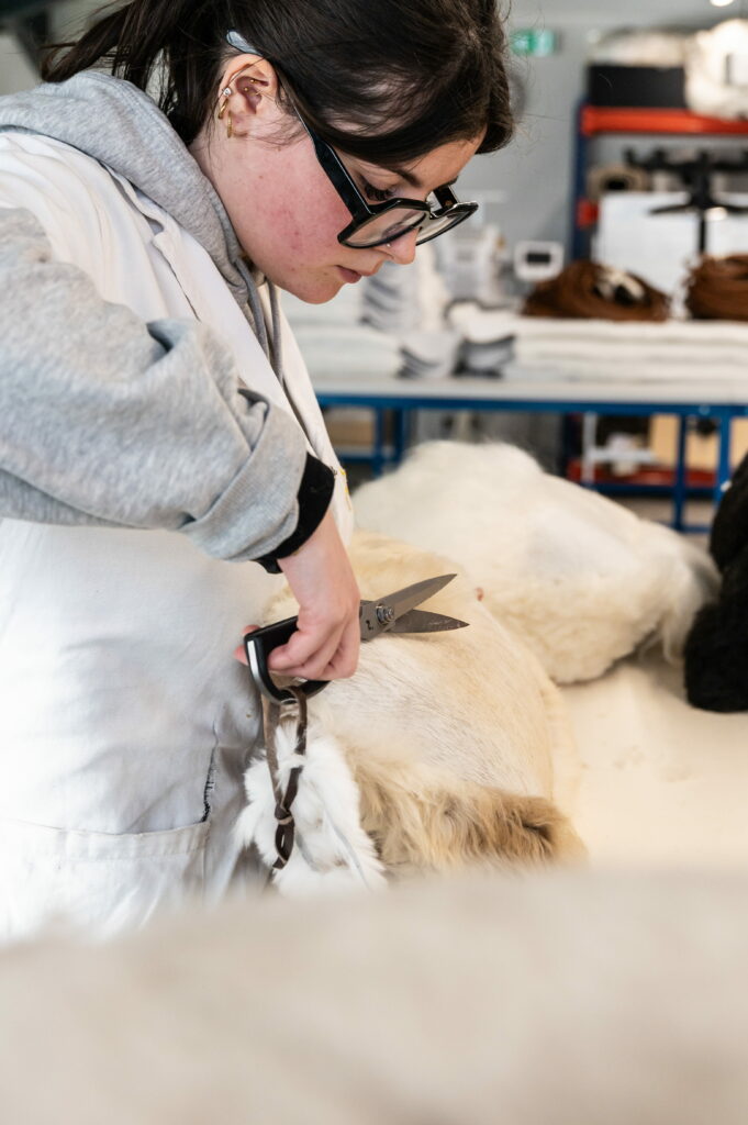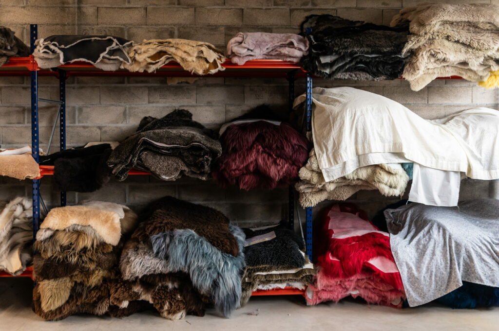 Celle du stock, où reposent les peaux. Mouton, agneau, vache, cheval… des matériaux issus de l’industrie agroalimentaire, sourcés exclusivement en Europe. Les peaux brutes sont envoyées dans la propre tannerie Norki, en Pologne, où elles sont tannées et teintées au pigment naturel avant de revenir ici, pour être assemblées, découpées et brodées à la main.