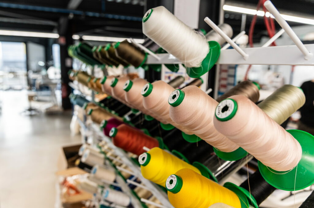 Dans l’atelier, le temps semble suspendu. Les mains de douze femmes travaillent. Minutieuses, silencieuses. Zoé, spécialiste de la broderie de Lunéville. Elin, la Finlandaise de l’équipe. Zélie, passée par la sellerie au Canada. Toutes oeuvrent debout, sur des pièces exigeantes, et bénéficient d’un rythme pensé pour durer : quatre jours de production par semaine. « C’est un travail d’orfèvre. Il faut en prendre soin », confie Sonia Linard. Ici, ces artisanes ont trouvé un terrain d’expression rare. « Ce que j’aime le plus dans mon métier, c’est la diversité des projets. Aucun ne se ressemble. », confie Mathilde, chef d’atelier. C’est elle qui a impulsé la broderie 3D, mêlant mousse et fil pour donner naissance à des volumes inédits. Lorsque l’on évoque la présence quasi exclusive de femmes à l’atelier — ce jour-là, un stagiaire homme se fond dans la masse — Sonia Linard sourit. « Ce n’est pas volontaire. Mais je crois profondément que le travail est un levier essentiel de la liberté des femmes ». À la fin de la visite, un cylindre animé de reliefs attire notre oeil : c’est un écrin pour les champagnes Pommery. À l’extérieur, le château et sa façade bleue de style élisabéthain. À l’intérieur, l’univers Norki. Une pièce manifeste remarquable.